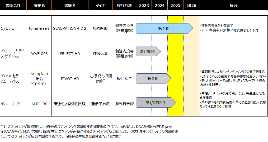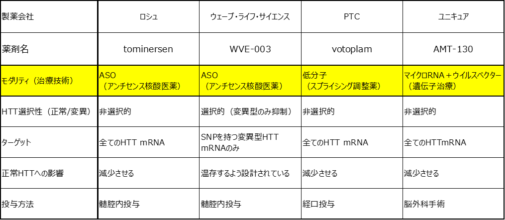 ・ tominersen、WVE-003、votoplamおよびAMT-130はいずれもハンチンチン遺伝子の発現を抑える治療法(HTT-lowering therapies)。